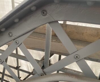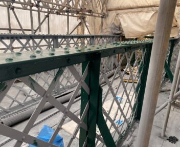 Access to the structure was provided through full scaffolding and encapsulation supplied by the client, allowing the works to be carried out safely and in a controlled environment. J M Brown Ltd then undertook full surface preparation to SA2.5 standards by means of abrasive blast cleaning, removing the existing coatings and contaminants to expose clean steel ready for the application of the new protective system.