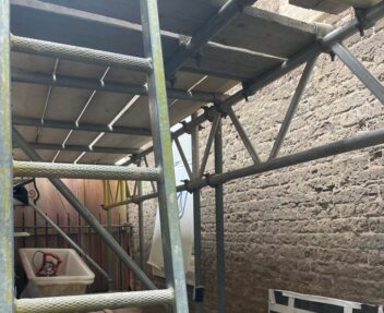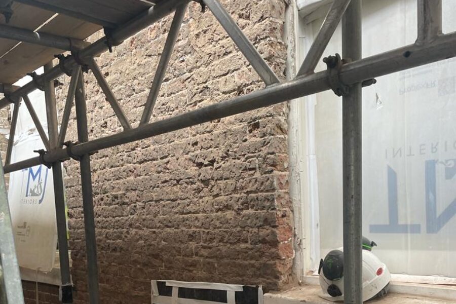 The team carefully removed the failing render from all external elevations to expose the substrate and assess the condition of the masonry beneath.
